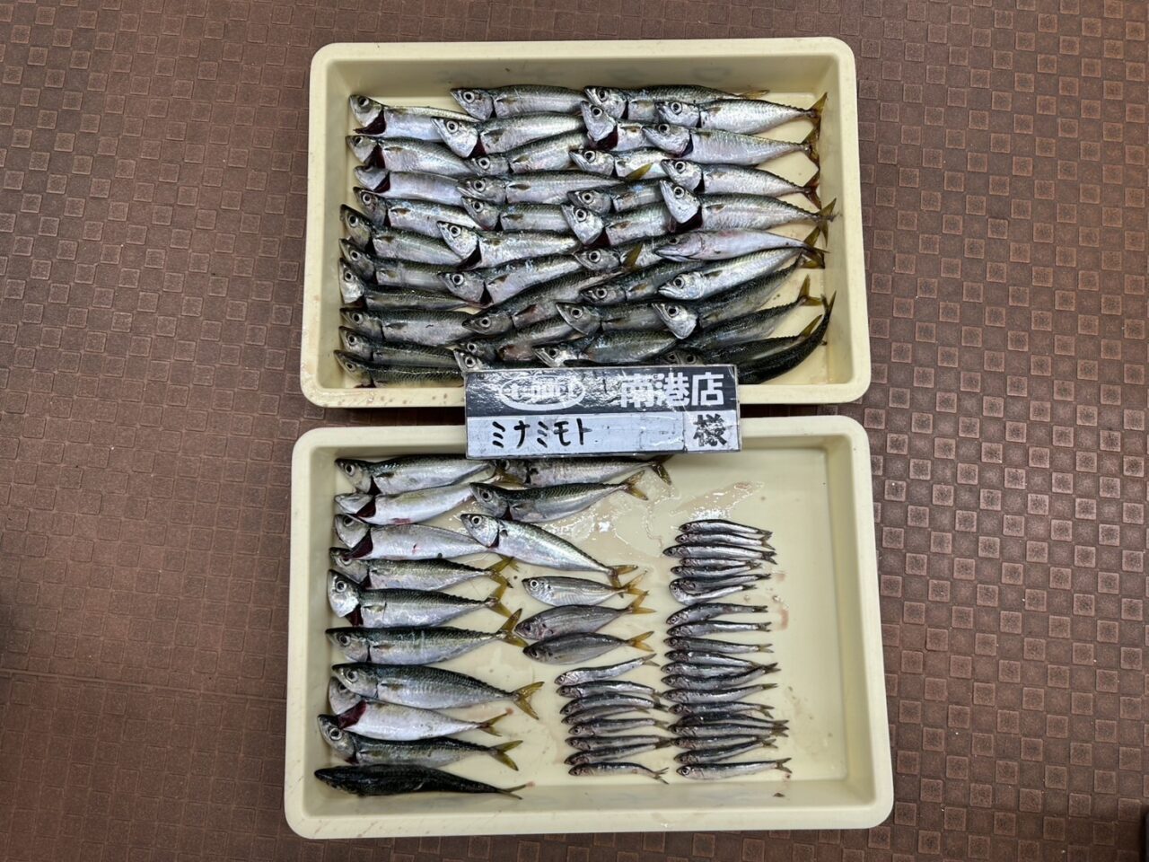 令和7年9月21日(日)南港大橋 南本さん サバ 22cmまで 53匹、イワシ 11cmまで 28匹 アジ 14cmまで 3匹 釣り方:サビキ釣り エサ:アミエビ