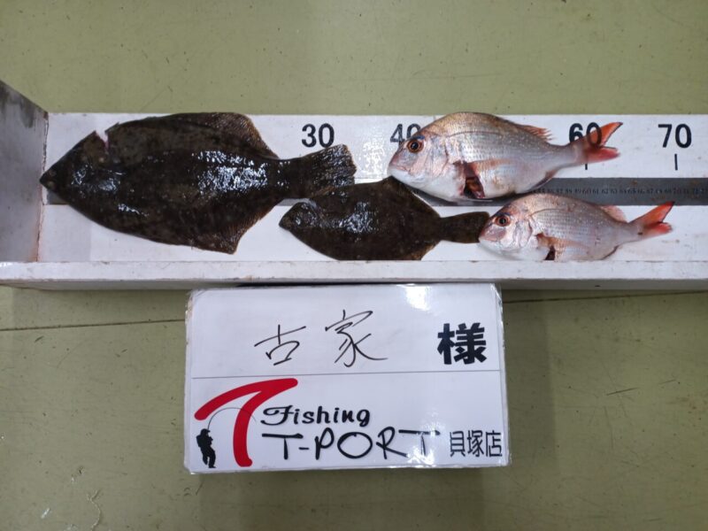 R7.11.2(日) 泉南 阪南市 古家 辰彦さん マコガレイ 23.5~34.2cm 2匹 真鯛 22.7~27.1cm 2匹 釣り方;投げ釣り エサ;青イソメ