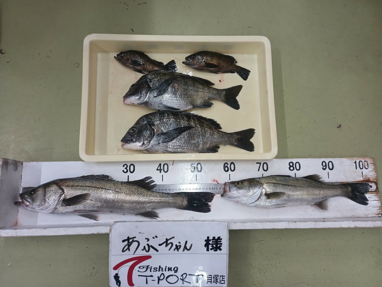 R8.3.30(月) 貝塚人工島 貝塚市 あぶちゃんさん ハネ 44〜55cm 2匹 チヌ 38,5〜42,3cm 2匹 メバル 20〜22cm 2匹 釣り方;エビ撒き釣り エサ;活きエビ