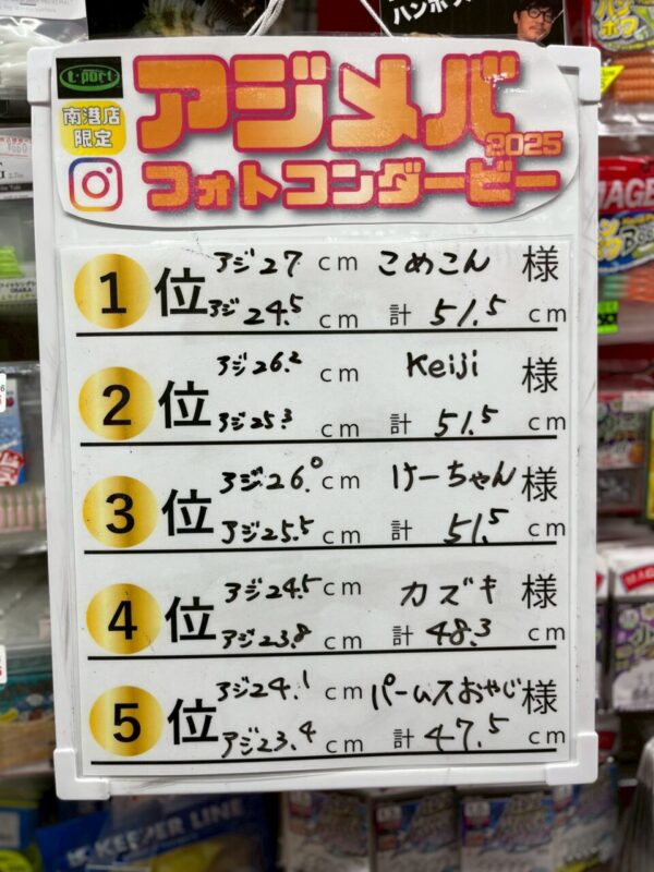 いつもTポート南港店をご利用いただきありがとうございます! 9月1日~10月31日まで開催しました アジメバフォトコンダービー2025【第一部】の最終結果が出ましたので発表いたします!