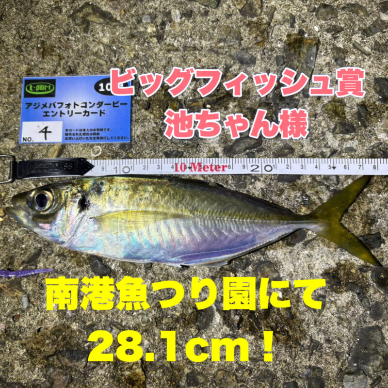 入賞者は上記5名の方となりました! 【ビッグフィッシュ賞】 池ちゃん様、地元南港にて28.1cmの大型アジを釣り上げられました。 ご参加エントリーいただいた皆様ありがとうございました! 11月1日より【第二部】が始まります。 第二部は12月28日までとライトゲームシーズン最盛期となりますので 更に盛り上がることでしょう!! 仕切り直しでエントリーどしどしお待ちしております!!