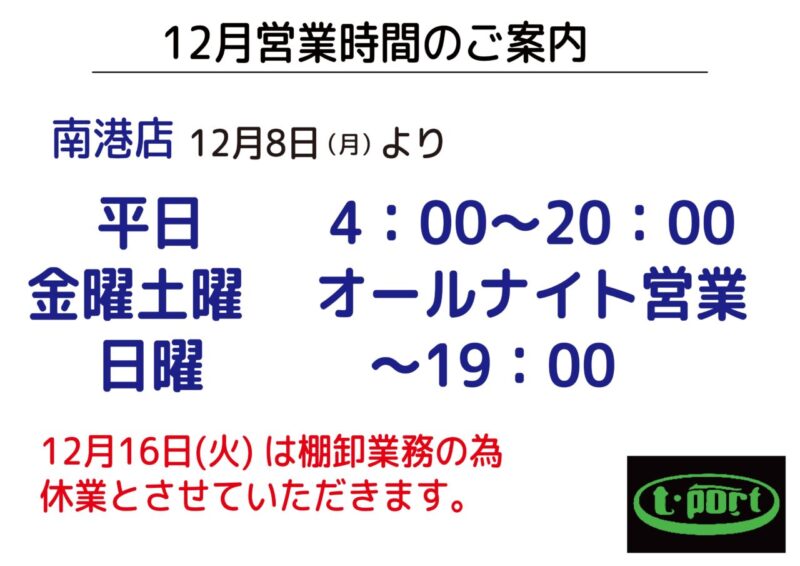 12月8日(月)より平日の閉店時間が20時までに変更となります。