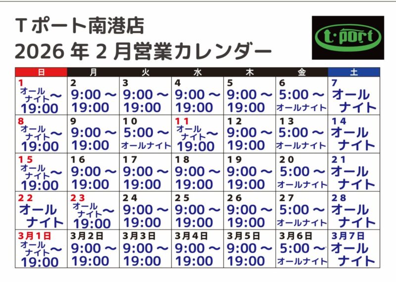Tポート南港店です🐟 いつも当店をご利用いただきありがとうございます! 来週から営業時間がイカの通り変更となります。 ご不便・ご迷惑をおかけいたしますが、何卒ご了承ください。 (※詳しくは営業日カレンダーをご覧ください)