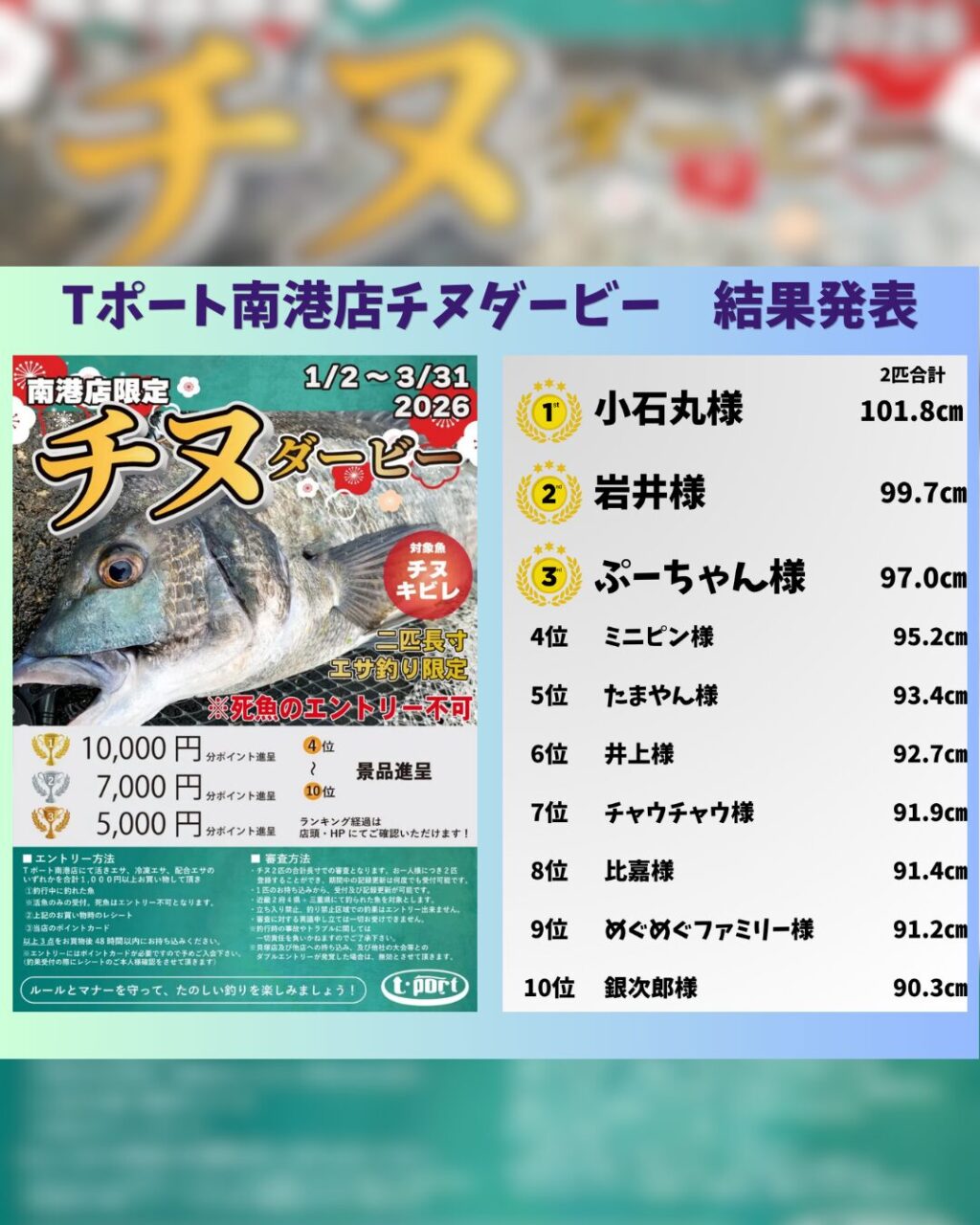 激戦のチヌダービーが終了いたしました! ご参加いただいた皆様、ありがとうございました! そしてお疲れ様でした☺️ というわけで、結果発表です◎ ランクインした皆様おめでとうございます👏 追って連絡させていただきます! 今後も皆様で盛り上がれるようなイベントを考えていきたいと思います!