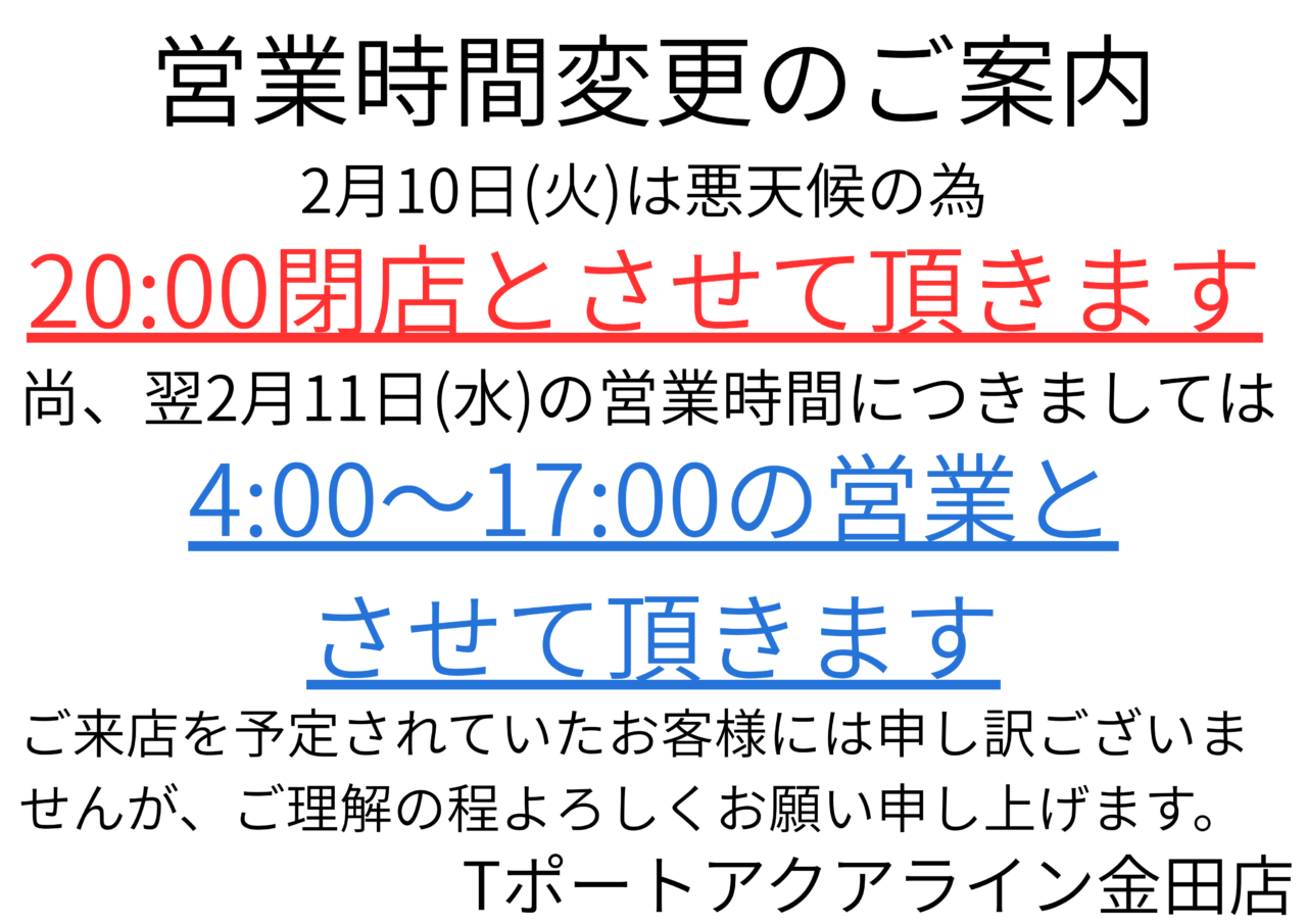2026年2月10日(火)は悪天候の予報の為、オールナイト営業を取りやめ9:00開店~20:00閉店とさせて頂きます。